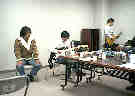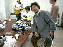 本番前の控え室 な、なんや、このおっさん? だれあろう斉藤一志君です。体をはってみんなの緊張をほぐしてくれてます。(たぶん) |
